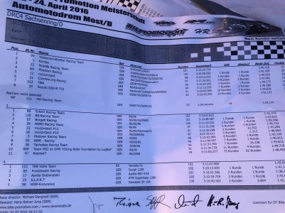 Wir führten kurzzeitig die Klasse 3 an, allerdings war das Eckert Racing Team super stark mit ihrem ersten Fahrer Ralf. Die Sicht auf Start/Ziel war zum Teil bei NULL, wenn 4-5 Fahrer vor einem fuhren. Das Wasser lief die Berge hinunter, es regnete immer mehr...wirklich keine leichten Bedingungen. Nach einer Stunde der Wechsel auf Basti. Der zog ebenso eine Stunde durch und sicherte und immer mehr Abstand zu Platz 3, Borgelt Racing. Dann ging Benny auf die Strecke und wir spekulierten auf einen weiteren Wechsel. Als die Zeiten kanpp 15min vor Rennende kippten, ging ich nochmal mit Slicks raus und konnte noch vorm Klasse 4 DLC Meister 2016, Team Aprilia Grebenstein, ins Ziel fahren.