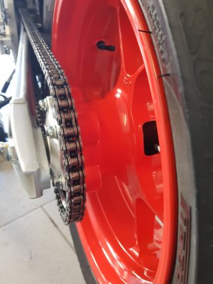 Hab heute die originale Kette gereinigt um auf S100 Dry Lube wieder umzusteigen.Das Kettenfett war wieder so zäh und überall.Beim nächsten Radausbau muss die Schwinge nochmal ran.Für mich ist das Ergebnis ok.Schöner wäre noch eine goldene o.schwarze Kette.....aber für diese Saison noch nicht.