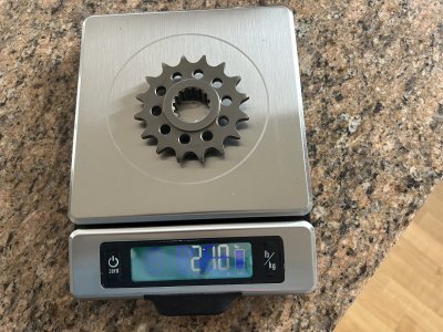 @TXRMunich hat das Originalteil bereits gewogen, kommt mit den original Muttern und Unterlegscheiben auf 880 Gramm! Ein Kettenrad von Superlight mit Titanmuttern kommt auf 268 Gramm. Das Ritzel ist wohl ebenfalls 80 Gramm leichter. Das sind dann an die 700 Gramm, die man einsparen kann. Macht deutlich mehr Sinn!